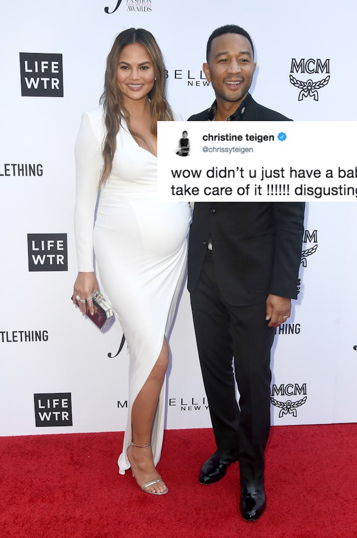 While Legend was being interviewed on the red carpet, and the commentator asked him about his son, Teigen, who was watching from the comfort of her own couch, took the opportunity to ask a paramount question. "Wow didn't u just have a baby John smh go take care of it !!!!!! disgusting," she wrote on Twitter.