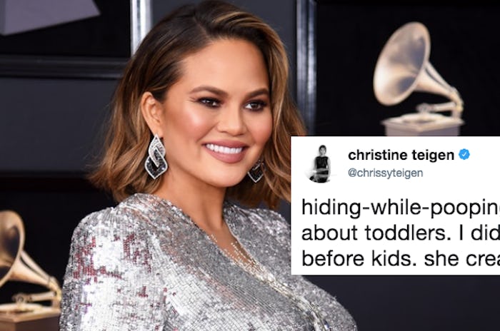 There are so many things that no one adequately prepares you for before becoming a parent. Sure, people will endlessly point out that you won't be sleeping much for the next decade or so. Or that "breast is best," so you better breastfeed that baby *or else.* And of course, seasoned parents will remind expectant couples to "enjoy every minute." But seriously, where are all of the heads-up advice on subjects like pooping? Like the fact that a baby's first bowel movement will literally be the consistency of tar. Or that cleaning up an infant who has pooped up his back and into his own hair will probably happen at some point in time? Well, one celebrity mom is clearly breaking from the norm, as she addresses a truth bomb about toddler defecation. And honestly, Chrissy Teigen's tweet about pooping toddlers and their bizarre bathroom behavior is relatable AF.