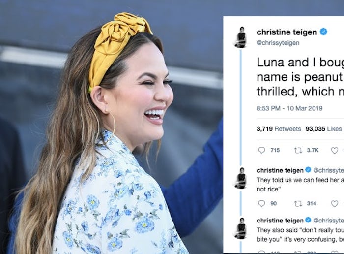 There's a new member of the Teigen-Legend family, and its name is Peanut Butter. Over the weekend, Chrissy Teigen tweeted about getting a hamster and took her followers along for the wild ride. But her foray into rodent pet ownership didn't quite go as planned, as she revealed in a series of tweets. And honestly, Teigen's questions about the new addition to her household will speak to any parent who's ever been suckered into getting a hamster.