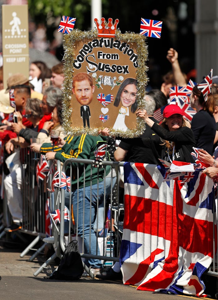Some fans decked themselves out in United Kingdom-themed gear, and they carried Harry and Meghan-emblazoned U.K. flags.