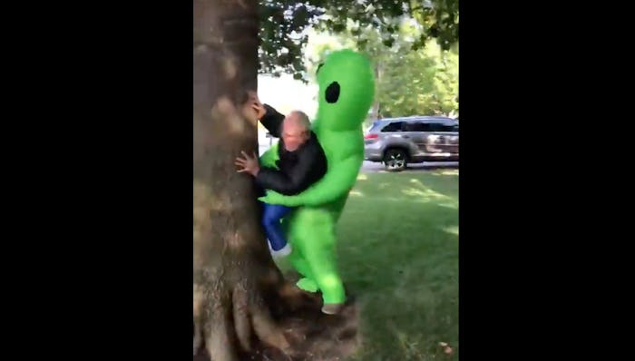 On Sept. 21, a Twitter user by the name of Anna Beffer posted a video of her dad in their front yard. In the video, he is wearing a costume that is a blow up "alien" holding a person captive. The costume functions as follows: your head is sticking out, so it seems as though you are the person the alien is holding. However, your arms and legs are controlling the rest of the alien costume, so you can essentially run around in circles and make it seem like you're being abducted. Well, her dad saw an opportunity, and did not miss taking it.