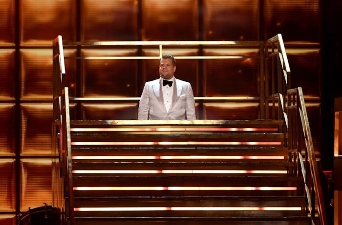 This stunt was way too perfect and hilarious to not have been pre-meditated. And for the most part, Twitter loved his little fake-out. (Celebrities! They fall too! They're just like us!) And while some of you (myself included) may have been a little bummed that there wasn't a carpool karaoke skit at some point in the intro, Corden did manage to incorporate a bit of music into his opening monologue by doing a bit of rap to get the party started. And, as I'm sure will turn out to be a theme throughout a majority of the night, a few of his lyrics were also slight jabs at our current president.