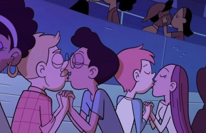 The show follows a magical princess named Star Butterfly living on Earth with her best friend Marco Diaz. In the episode in question, Season 2's "Just Friends," Star and Marco are attending a boy band concert – an obvious rite of passage for all tweens – and enjoying themselves to a particularly romantic song. The song has such an effect on the audience that it starts off a waterfall of smooches. All kinds of couples are depicted in the moment, including four same sex couples: two that are two men, and another two that are two women. And there could be more – it's like a Where's Waldo of kisses. The best part is that none of the kisses treated differently: the couples are just a few out of many who are enjoying themselves on a night out.