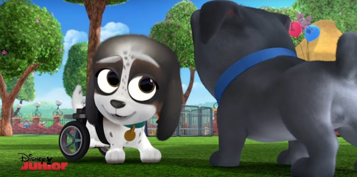 I love TV, I love puppies, and I love disability representation. So I might have to start watching kids shows because Disney's Puppy Dog Pals is introducing a disabled character and I have so many happy feels about it. The new character, Lollie, meets sibling pups Bingo and Rolly at a pet adoption event. She's a little different than other puppies there because Lollie moves around with wheels in place of her back legs. The characcter is voiced by Giselle Eisenberg who played Sophia on the CBS show Life In Pieces. But the best part about Lollie's introduction is that she's not just a guest — Lollie is a recurring character on the show.