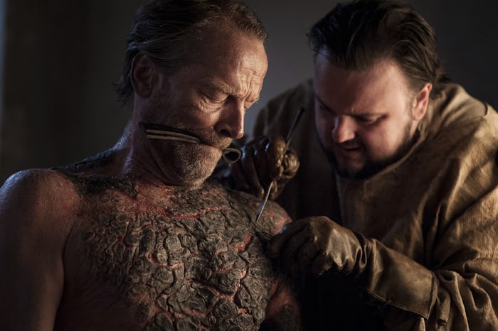 And it's true that when we first saw Ser Jorah, greyscale had taken over his entire arm and had begun to spread across his torso. The archmaester gave him a prognosis of only six more months' worth of mental acuity before the disease overtook his mind. But Samwell spent all night reading up on possible cures and decided to take matters into his own hands. Late one night, he snuck into Jorah's chamber at the Citadel and attempted a surgical procedure with only rum and Jorah's self-control as anesthetics. Sam proceeded to slice off Jorah's top layer of infected tissue and then applied an ointment to his raw skin.