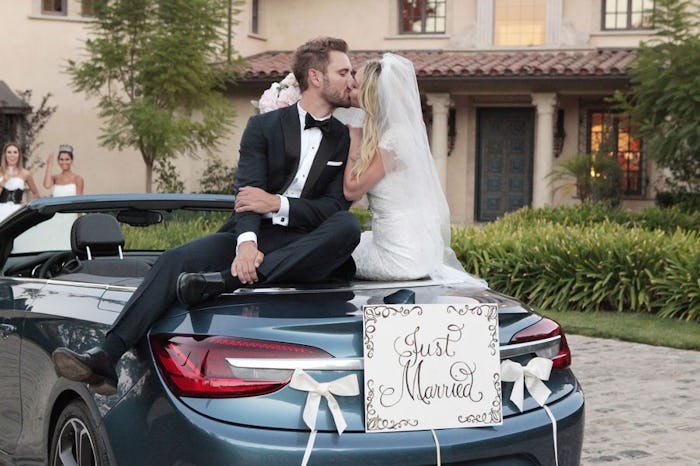 Corinne Olympios made a big impact in the premiere episode of The Bachelor Season 21 even though she didn't end the evening with the first impression rose. Not only was she the first to lay a somewhat awkward smooch on Nick Viall, but promos for the season show her putting herself out there in a big way. She has no problem making waves in her quest to win Nick's heart, whether that involves flinging off her bikini top for a photoshoot or surprising Nick in his hotel room late at night. She's already being framed as the villain of the season, but considering Nick was once dealt the same hand, he could probably sympathize with Corinne more than a little. So does Nick end up with Corinne on The Bachelor?
