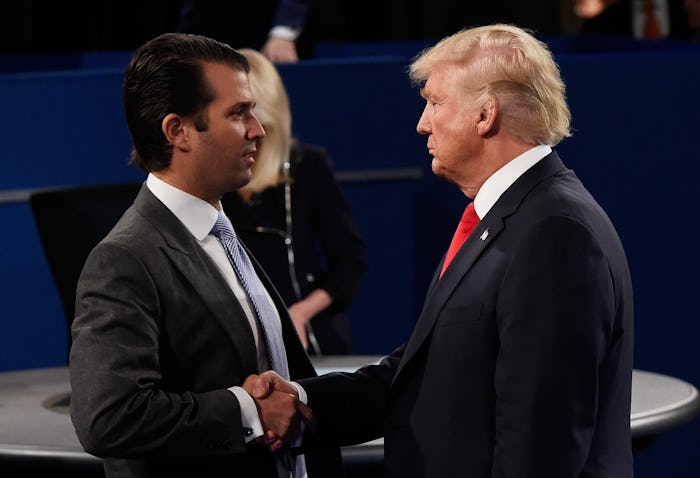 Just weeks after President Donald Trump secured the Republican presidential nomination, his eldest son reportedly had a meeting with a Russian lawyer who was said to have damning information about his Democratic opponent, Hillary Clinton, according to an article published in The New York Times on Tuesday. In response, Donald Trump Jr. tweeted out an email chain that led up to the reported meeting last summer. There are indeed many opinions about what's said in the emails — with some saying he may have crossed a line of legality — but what does his father have to say about all of this? While he has yet to weigh in on the matter, President Trump's response to Donald Trump Jr.'s emails will definitely be important to watch out for. Trump Jr.'s representatives have not responded to Romper's request for comment regarding whether he could face charges for collusion, but as of now Trump Jr. has not been charged with any crimes.