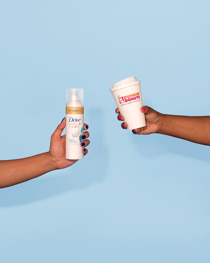 Like so many trends, the love for dry shampoo and coffee began online. "Social media has exploded with women sharing how coffee and dry shampoo are their secrets to getting up, out and on with their day . . . taking them from the gym, to the carpool, to the board room,” said Piyush Jain, Vice President of Haircare for Unilever. "We’re excited to bring together this unlikely but perfect pairing in a surprising collaboration between Dunkin’ and Dove Dry Shampoo." Plus, this particular campaign has some events in the real world as well.