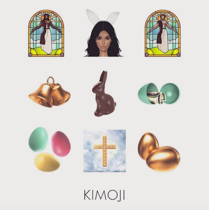Consider it your Easter present: Kim Kardashian released Easter-themed Kimoji Thursday, and it's everything you would think it would be (black Jesus included!). The reality star announced the latest additions to her mega-popular app on her website and various social media accounts, according to Us Weekly, and, somehow they filled an emoji void the world didn't even know it had. The collection — which will be automatically added to your keyboard if you use iOS — includes a mix of religious and non-religious images: Easter eggs, a chocolate Easter bunny, a cross, and two different Jesus emojis. But since it wouldn't be Kimoji without Kim's face, there is also a 'Kim with bunny ears' emoji, and an Easter egg containing a wad of cash (how do I get in on that Easter egg hunt?!).
