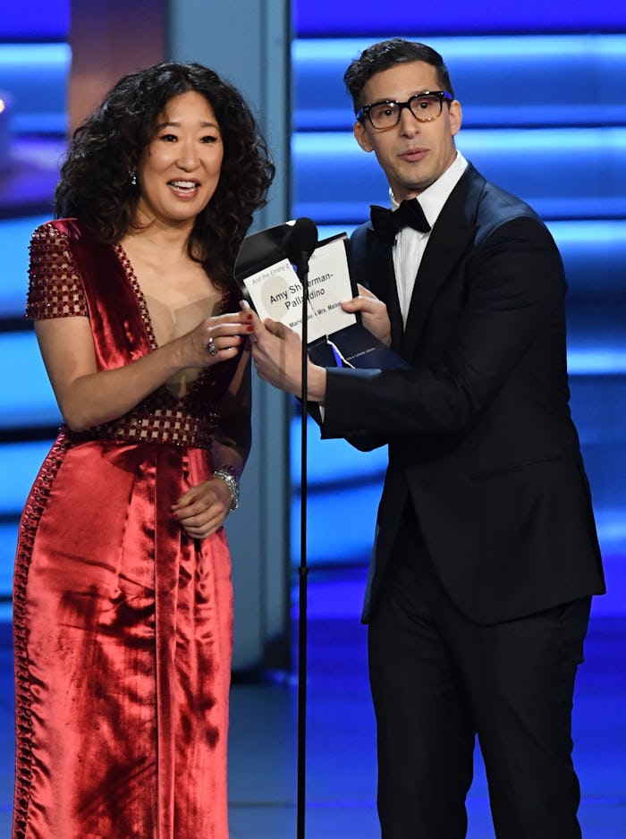 Plus, the reputations of each actor made them natural choices for hosts of the most fun awards show in Hollywood. Oh was fresh off the success of the Hulu drama Killing Eve (for which she's nominated for Best Actress in a Drama TV Series, by the way), and she's long been a favorite of Grey's Anatomy lovers for her role as Dr. Christina Yang. Likewise, Samberg has branched out since his SNL days to become the beloved Jake Peralta on Brooklyn Nine-Nine, and even has hosting experience from the 2015 Emmy Awards.