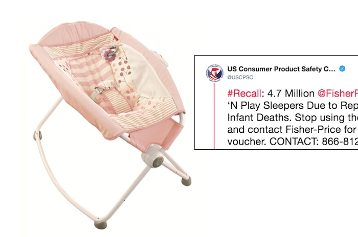 And on Friday, April 12, the CPSC issued a recall notice on roughly 4.7 million Rock 'n Play Sleepers. "Infant fatalities have occurred in Rock ‘n Play Sleepers, after the infants rolled from their back to their stomach or side while unrestrained, or under other circumstances," the CPSC said.