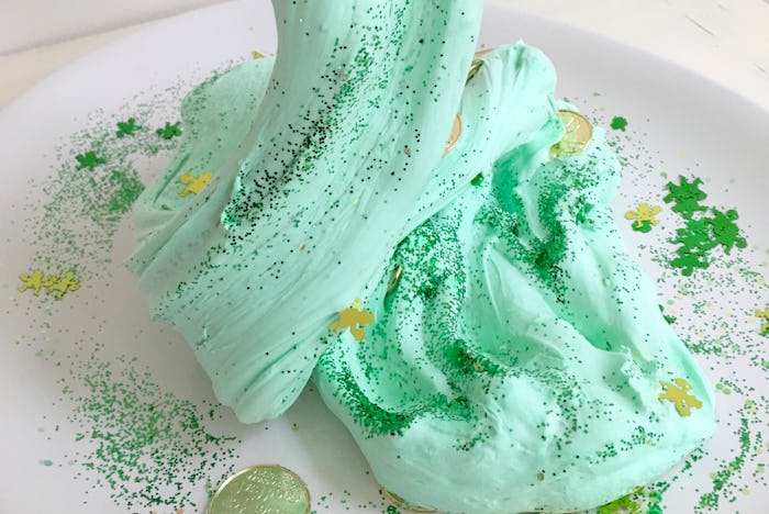 There are many different recipes for making slime, often using ingredients you already have around the house. If you ever wondered why they sell Elmer's glue in giant containers (because how much gluing could one kindergartener do?), it's because everyone's making slime. The bloggers at Little Bins For Little Hands have put together a Fluffy St. Patrick's Day slime recipe, which uses shaving cream along with the more commonly used slime ingredients like glue, saline solution, baking soda, and food coloring. The first step is to mix the green food coloring into the shaving cream. After that, you can mix in the other ingredients and knead away. "This St Patricks Day fluffy slime is an amazing tactile sensory experience for kids of all ages who love to get their hands right into their play," Sarah McLelland of the Little Bins For Little Hands blog tells Romper. "Not to mention that making slime is also an excellent science demonstration. Hands on play and learning all in one extremely cool slime activity," she says.