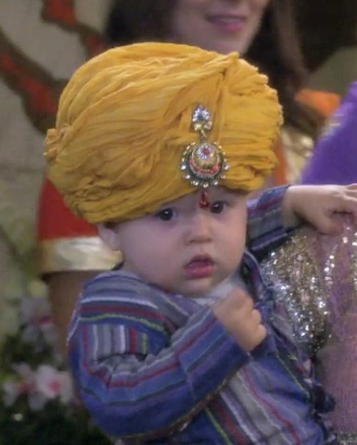 Everyone is dressed up in "traditional Indian" garb for the party, but they are way off. Turbans are mainly worn by Sikhs in India. In fact, if you Google "turban, meaning" that's actually in the definition of the headress. Go ahead, try it. People other than Muslims or Sikhs might don one for a wedding or something, but they are meant to cover the head for religious purposes.