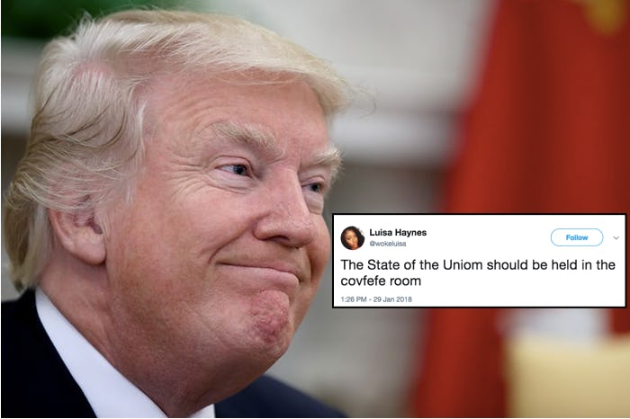 A favorite from this presidency, the original Trump typo "covfefe" made its way back to my timeline. In case you've somehow managed to forget, Trump first confused the world by writing "covfefe" in a late-night tweet about the media back in May. The covfefe references died down for a while, but the "State of the Uniom" blunder has made it relevant yet again.