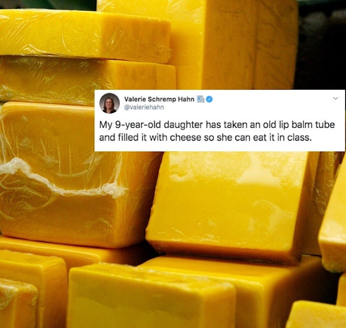 Like any proud parent would, the girl's mother took to Twitter to brag about her daughter's clever idea. "My 9-year-old daughter has taken an old lip balm tube and filled it with cheese so she can eat it in class," Valerie Schremp Hahn, a features reporter for the St. Louis Post-Dispatch, tweeted.