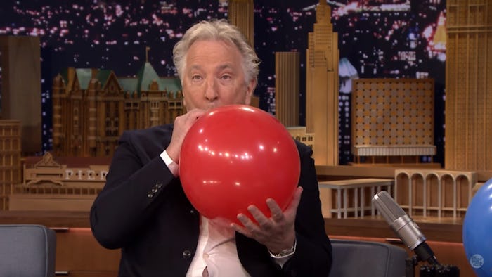 Indeed, Fallon and Cumberbatch did take turns reading hip-hop lyrics in Rickman's voice, and it was exactly as funny as one would imagine. But maybe not so funny for Rickman? As penance, Rickman orders Fallon to inhale helium from a balloon — or, as he refers to it, a "Jimmy Fallon truth-telling machine" — and explain himself. Man, missed opportunity to call the helium veritaserum, am I right? The results are, of course, adorable.