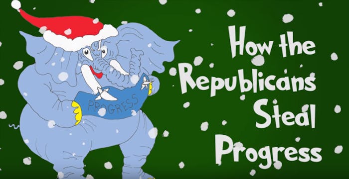 Narrator: American families like progress a lot. But the Grinches in GOPville, it seems they do not. Together they shout with great grinchy zeal, that on healthcare their plan is