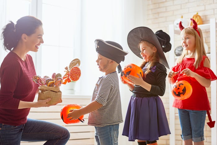 One New York City mom, Jacqueline Shaulis, tells Romper, "In New York City, trick-or-treating is quite different because so many people live in apartment buildings. In our building, there once was a couple that organized all the kids to go costumed to each 'home' and get a bit of the experience. Now, people primarily leave a candy dish by their door for the kids (or a note that they don't have candy). Also, our neighborhood businesses give away goodies for our apartment-dwelling offspring to experience actual trick-or-treating."