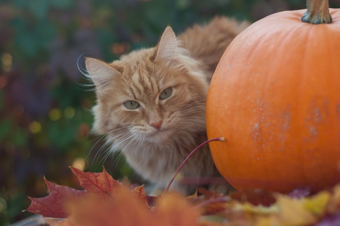 You guys, it's finally here. On Saturday, Sept. 22, the fall equinox is happening, which means you can now put out your pumpkins and turn the TV to Hocus Pocus without someone making fun of you. But it also means it's time for a shift in your life that doesn't involve pumpkin spice — it's time for some balance and restoration thanks to the star power of the fall equinox. But how will your feline friends fare? Turns out, the fall equinox affects your cat in the same way it affects a lot of animals.