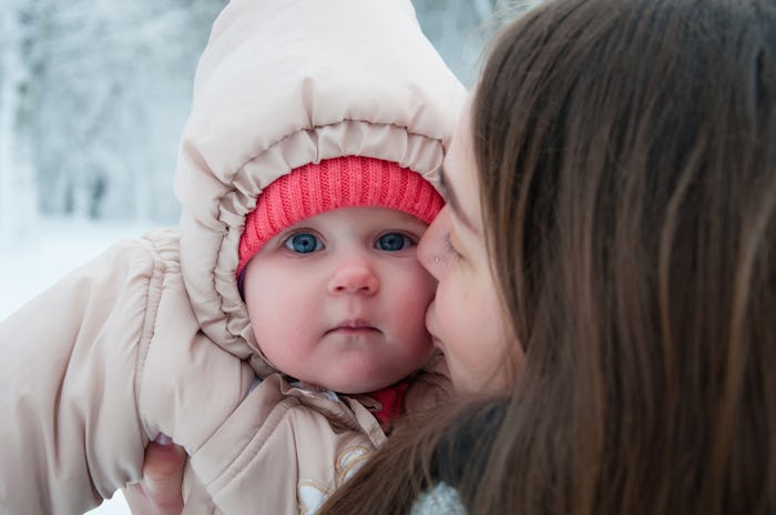 In an interview with Romper, pediatrician Jarret Patton says that when you go outside, your baby will certainly be more sensitive to cold than you will be, and that the frigid air can be harsh on their exposed skin, causing chapping and eczema on their cheeks and face, so it’s a good idea to keep them properly covered. Patton says one of the most important layers for a baby in the cold weather is one that covers their head, like a hat or hood. “Remember that the baby loses most of their heat through their head,” says Patton, “so make sure that it remains covered.”