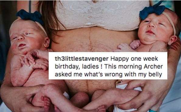 I love this fierce mama! Although I haven't experienced a twin pregnancy, I do have a few stretch marks around my belly button thanks to my three singletons. I'm pretty sure both my 6-year-old and 3-year-old have ran their fingers over the marks, asking why I had them. Except, my response was a little more technical; I explained that sometimes, a mommy's skin on her belly stretches so far that it leaves permanent lines. Which is true, even if it's infinitely less empowering than Garnett's response. And it also explains why I don't have 53,000 followers in Instagram.