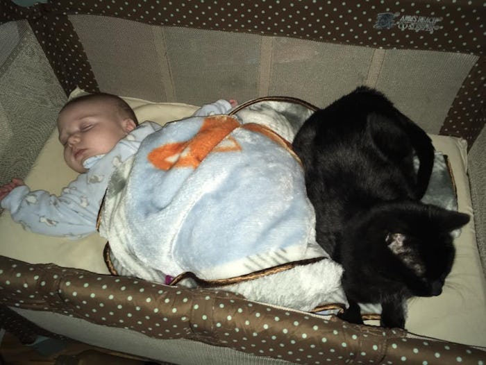 Since pretty much the beginning of time, cats have gotten a bad rap — reputed to be evil and to harm sleeping babies "by stealing their breath." Yikes. Any cat owner (including this one) will tell you that despite their tendency to knock things off tables, cats are pretty damn awesome. I personally think cats can be great pets for new parents. I have, however, wondered how to keep my cat out of my child's crib, because seriously I think she sleeps in there more than my baby does. Thankfully, and according to experts, there are things parents can do to help keep their baby safe (and their cat from claiming their crib for their own).