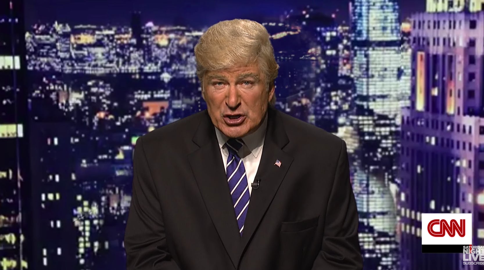The skit, which aired during the most recent episode of SNL, covers a lot of political ground from the past week. It starts with an encore presentation of Tuesday night's vice presidential debate — featuring cast members doing hilarious impressions of Democratic Party vice presidential nominee Tim Kaine and Republican Party vice presidential nominee Mike Pence. Or, as SNL calls them, "America's dad" and "America's step-dad," respectively. However, the debate is cut short by the breaking news of Trump's hot microphone video being released. And the person to defend Trump on CNN this time is not a representative of his campaign, but Trump himself — who does not apologize for his actions but "apple-agizes."