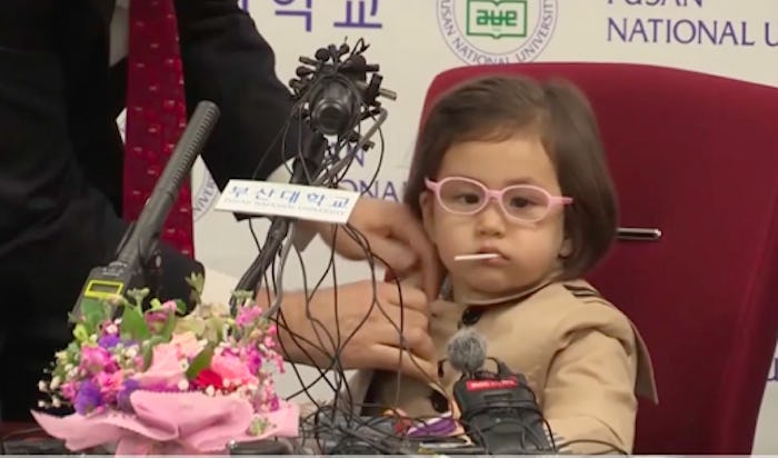World hero Marion Kelly, otherwise known as the "BBC Toddler," gave a press conference to reporters Wednesday with her dad Robert, a political science professor at Pusan National University. Wearing glasses, a cardigan, and sucking on a lollipop, Marion didn't look nearly as excited to be there as everyone else was about hearing what she had to say about her new internet fame and what she was really thinking when she crashed her dad's live interview. But that doesn't mean the event was any less wonderful and if you missed it (don't worry if you did, it aired pretty early in the morning here in the United States), there are plenty of ways to rewatch the BBC toddler's press conference from Wednesday, if only because you need a good laugh.