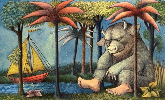 There is an essay from the early internet about the importance of being alone — the gist is that we've lost the art of aloneness. I can’t find the piece, though I’ve spent a bit of time exploring old internet corners for it. The funny thing about Where The Wild Things Are, for being universally beloved, is that it’s a very lonely book — the only people in it are Max, or people Max made up. The Wild Things worship Max, but in the end, it isn't enough — he wants real people to care about him. He's a kindergarten runaway who never gets further than the end of the driveway.
