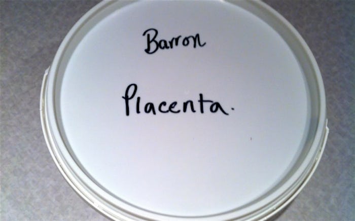 My labor and delivery ended up going about as far from what I was expecting as possible. After many hours, I ended up having a C-section. I’d honestly completely forgotten about my placenta and would’ve gladly tossed it directly into Satan’s gaping maw if it would have helped end the ordeal any faster, but my doctor remembered, and when I finally got home from the hospital, my mom cheerily informed me that my placenta was in the freezer. My dad had taken it home from the hospital in a white bucket marked, “BARRON PLACENTA,” and I would’ve laughed at the idea of my 76-year-old father carrying my placenta home in a bucket if my whole torso hadn’t been aching.