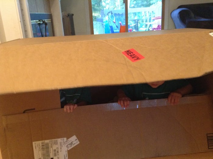 OK, hear me out on this one: What if toy stores are duping parents? What if the reason why kids love boxes so much is because it’s the only toy they ever truly needed? I decided this was the perfect opportunity to see what was so great about playing with a big cardboard box. I vowed to let my kids play with it for as long as they were interested, but totally expected the box to be curbside by lunchtime.