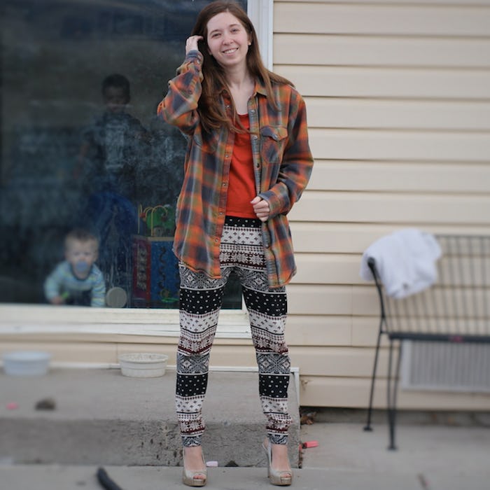 After a week of being disappointed with my pants, she found a pair of aztec print, faux fur-lined sweatpants she was completely pleased with, and topped off my look with my husband’s flannel shirt that she found on the bed.