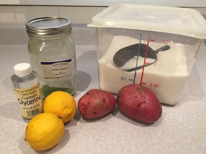 The second remedy I tried was potato juice. This one interested me because when I had a bad bout of mastitis a couple weeks after giving birth, my mom made me a boob poultice out of raw potato. Which sounds utterly ridiculous and bizarre, but it works! I figured that if potato could take down fever and swelling from a blocked milk duct, then maybe it had other magical healing properties to offer.