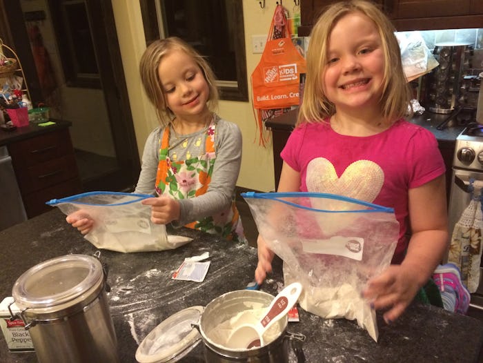 I got the meat area clean, then I got out the ingredients for the bread: a Ziploc with flour, salt, yeast, sugar, and oil. Should be simple, I thought. But when I looked at the bags of goo, I realized something had gone horribly wrong and they looked pretty limp and watery. They weren’t rising or expanding or bubbling. Then I realized I’d given my girls a half a cup of flour, while the recipe called for three cups of flour. Then I started to smell a burning aroma.