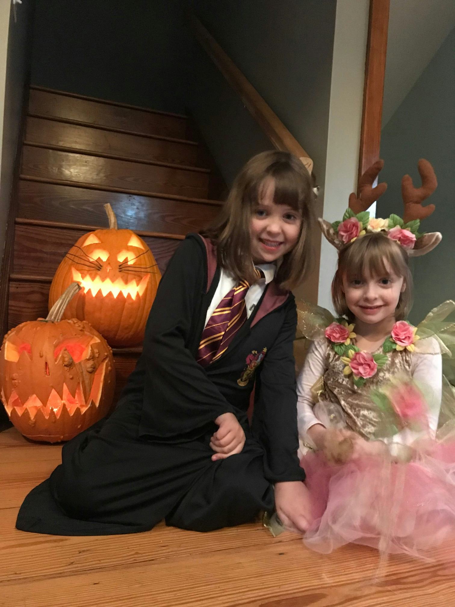 This time we went out just the three of us. My husband stayed home to give out candy, and we declined invites to join friends so that we could go at our own pace, and once again, I figured we'd be fine. What I didn’t think about was that, unsurprisingly, not a single driveway, porch, walkway or front door was any more accessible than it had been the year before. I just assumed that this time, neighbors would be able to see Freyja from a distance and understand that they needed to come to her. Sadly, not one of the generally delightful, friendly, kid-loving people who answered their doors came down to ground level because it was dark and they couldn’t see her. Instead, my older daughter had to do all the hard work. Somewhat apprehensive around strangers even at the best of times, she did not want to trick or treat alone, but I could not leave Freyja on the sidewalks or in the driveways to accompany her. At each house, Thora walked up the steps or onto the porch to ring the doorbell alone, carrying both candy bags. I watched her point to the two of us standing in the shadows just beyond the porchlight, explaining that she’d like to take another piece for her sister who can’t get any closer because she has a disability. Yes, that’s her over there in her wheelchair. What? You can’t see her costume? Oh right. Well, she’s a fairy. Oh me? I’m Hermione.
