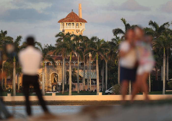 President Donald Trump's Palm Beach club, Mar-a-Lago, just became a lot more controversial. While dining there over the weekend while entertaining Japan's Prime Minister, Trump apparently conducted some very formal business on the club's terrace — in full view of non-government, regular-folk club members, one of whom even posted about it on Facebook. Is it safe for Trump to hold security meetings in the open? Probably not, but he did it anyway, and he'll probably do it again. Romper reached out to the White House for comment regarding the situation, but didn't hear back.