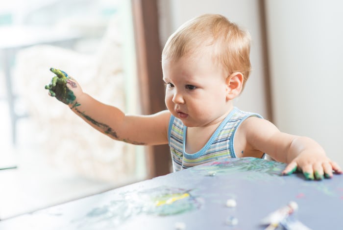 Water-based finger paints are likely your best bet in terms of safe paints for your little one. Many are non-toxic and washable, which makes clean up just a little bit less of a concern. Regardless of type, most paints that you'd likely be choosing from won't be the paints that contain heavy metals, according to the Princeton University Office of Environmental Health and Safety. The website went on to note,if you read the product list and notice that things are described as "hues," that means the pigment does not contain metal, and so should be safe for kids. Again, make sure you use non-toxic paint and keep your baby's hands out of his mouth as much as possible, just to be extra safe. Painting and then immediately cleaning one hand at a time should help with that.