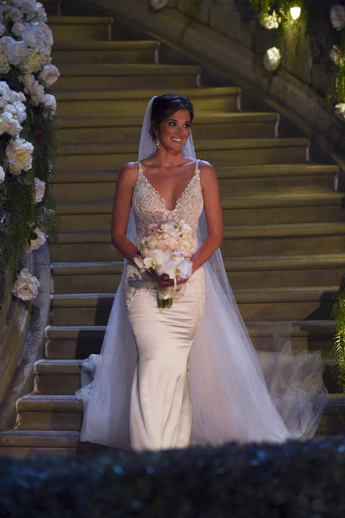 The couple actually got married on Jan. 24 as the wedding was pre-taped for the Valentine's Day special. The show tried to keep it a secret, but word eventually got out. The bride wore a beautiful, custom-designed gown by Galia Lahav featuring a beautiful lace bodice, plunging neckline and stunning train.