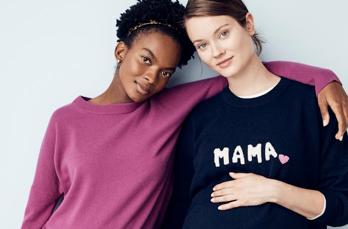 In true J.Crew fashion, you can be sure to find some more casual pieces as well. These buttery soft cashmere sweaters also come in a light heather grey that will literally go with anything. But the "Mama" sweater has our hearts.