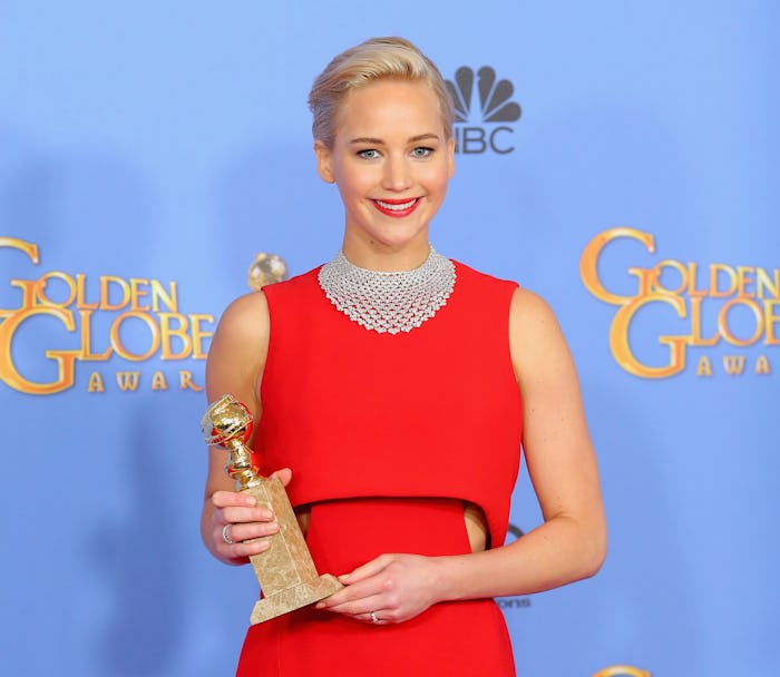 Well, it's at least a good advertisement for whatever long-lasting lipstick Jennifer Lawrence uses. After winning the Best Actress award for Joy at the Golden Globes, Jennifer Lawrence left a lipstick stain on David O. Russell's cheek — and he was clearly quite content to keep it there. For the long haul. Seriously.