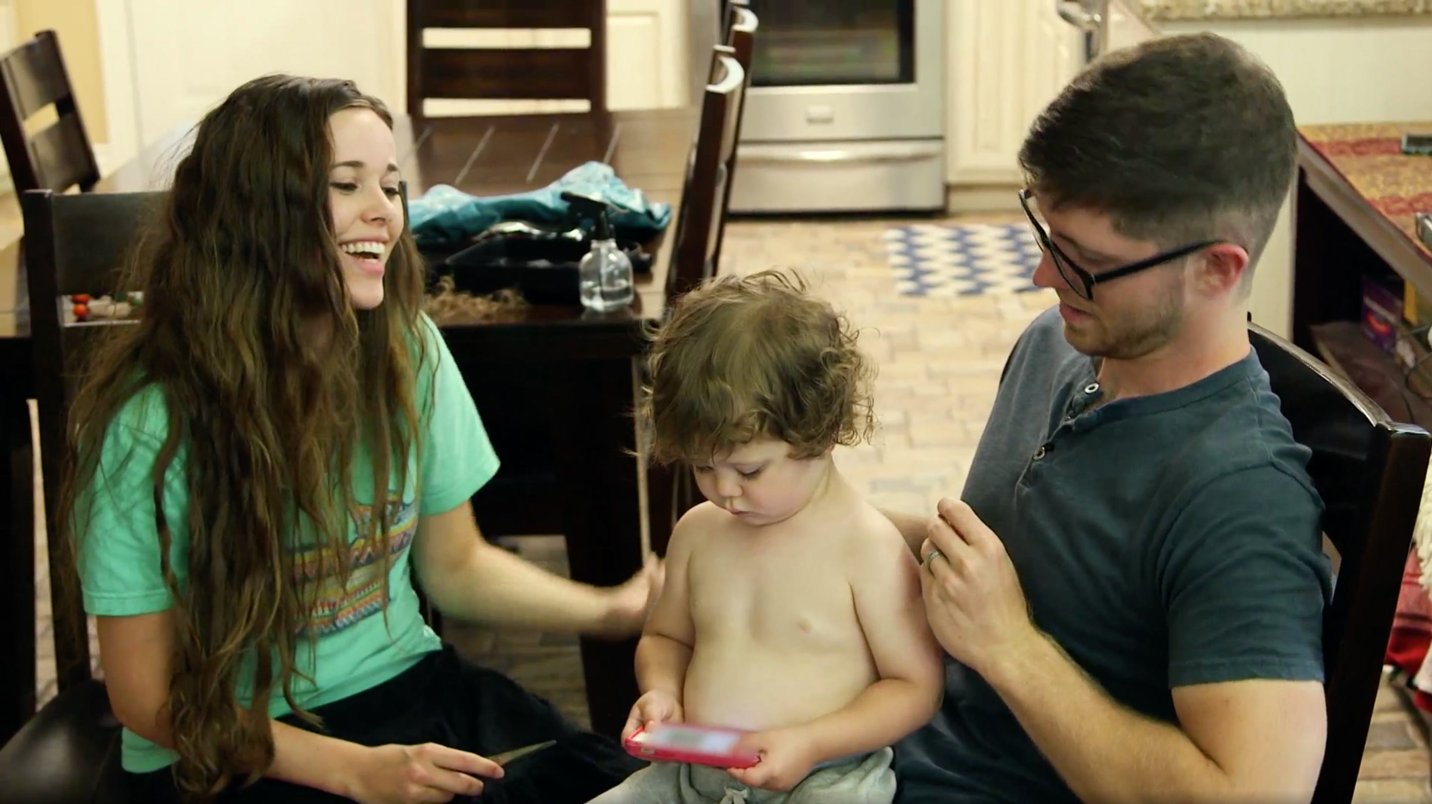 "So sad!" Jessa says as she cuts one of the first ringlets. "His precious little curls! Nope, don't look," she tells herself as she places the ringlet aside. Ben's strategy of distracting him with cartoons on a phone seemed to work, because he remains calm during the haircut, happily distracted by the screen, only interacting with Jessa and the scissors a couple of times.