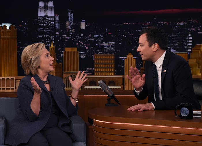 Fallon was, obviously, making fun of the whole "Clinton is sick and weak and therefore can never lead a country" routine. He welcomed Clinton wearing the surgical mask, and she laughed (by the way, Obama was right when he said Clinton has a great laugh. She totally does). Then, when Clinton hit Fallon up with a high five, he jokingly reached for the hand sanitizer as a "precaution".