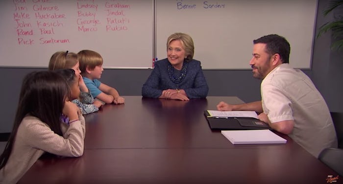 Hillary Clinton may very well be our first woman president, but what do our kids think? To find out, late night host Jimmy Kimmel joined Clinton to talk politics with kids, asking four pint-sized, future voters what they thought about a woman finally running this country. In the segment, which aired Thursday on Jimmy Kimmel Live, it looks like both Kimmel and Clinton got a kick out of some of the kids'... rather controversial (and hilarious) responses.