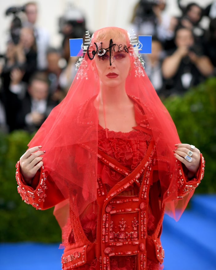 To say that Katy Perry has been switching up her look lately is the ultimate understatement. The days of brunette side bangs and lilac locks are long gone, but at the Met Gala on Monday night, she didn't even try to show off her edgy, platinum pixie cut. All of the Katy Perry Met Gala memes and tweets circulating assure that her red veil and tulle will be talked about for Met Galas to come, but whether the look will be admired for its avant-garde take on the theme or scorned forever for its overt oddness really depends on your own gala expectations.