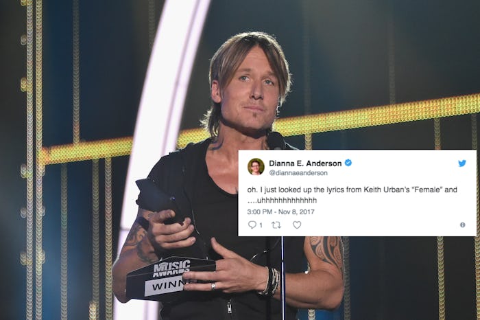 In today's edition of "Sh*t women didn't know they needed but are ever so *lucky* to have," Rolling Stone reported that Keith Urban released a song called "Female" in response to the growing number of women who have accused Harvey Weinstein of sexual harassment or assault. My first thought on this was, who in the hell still refers to women as "females" in 2017, outside of biology professors talking about mating rituals? But my second thought was no, thanks, I'm OK, Keith. I can go without "Female" and not lose an hour of sleep, not only because it was performed by a man and simply repeated all the hardships women already know they face, but also because it's being produced within a genre that has sexualized and debased women, contributing to a culture where such a song needs to exist in the first place.