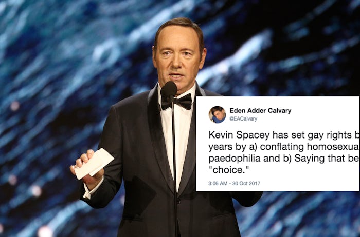 So far, Spacey hasn't responded to the backlash his statement is receiving, and a rep for Spacey did not immediately return Romper's request for comment. But the reaction on social media seems pretty clear: not only is the alleged sexual assault completely unacceptable, it's absolutely not OK to try and associate it in any way with being gay. Sexual abuse, harassment, and pedophilia have nothing to do with sexual orientation, and trying to suggest otherwise is dangerous scapegoating.