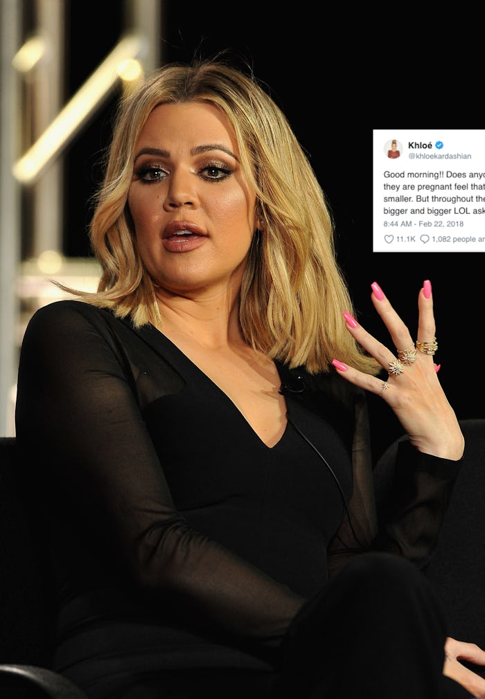 "Good morning!! Does anyone else who has been pregnant or if they are pregnant feel that in the morning their bumps are smaller," Kardashian tweeted Thursday morning. "But throughout the day their bumper gets bigger and bigger and bigger LOL asking for a friend" She topped the tweet off with a facepalm emoji, and let me just say: Khloé, no facepalm emoji necessary! It's totally normal to have questions about your bump, and it's never wrong to ask them.