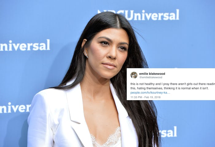 During a deleted scene from the Feb. 18 episode of Keeping Up With The Kardashians, it was revealed that Kourtney currently weighs 98 pounds, Us Weekly reported. The clip showed Kourtney, Khloé, and their friend, Simon Gebrelul, hanging out in Khloé's kitchen while making salads. Kourtney brought up a recent, strenuous run she went on, and then Khloé told Gebrelul, "You know she's 97 [pounds]?" To which Kourtney replied, "Guess what? I gained a pound. I’m 98 [pounds.]” She added, "You know Mason is 62 [pounds]?" Many people who caught wind of Kourtney Kardashian's weight took to Twitter to subtly (and not-so-subtly) shame her. "98 POUNDS?!" one person exclaimed. "honey sweetie no. everyone please don't think this is what you should be doing. Eat healthy & in good amounts but you don't have to do this. Weighing as less as possible isn't always healthy or sexy. Just take care of yourself."