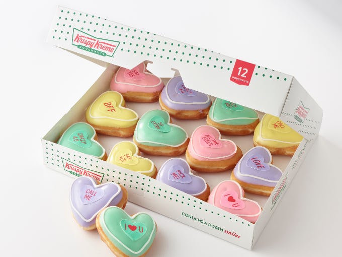 As of Jan. 30, fans of love and confetti-colored deliciousness will be able to treat themselves and others to adorable heart shaped donuts. Just in time for Valentine's Day, of course. Which should make Valentine's Day, a day I have often found to be a monumental disappointment, easy, stress-free, and full of yeast and sugar. Not to mention the ease of communication these Conversation Doughnuts from Krispy Kreme will afford everyone. As Krispy Kreme chief marketing officer Dave Skena noted in a press release to Romper: