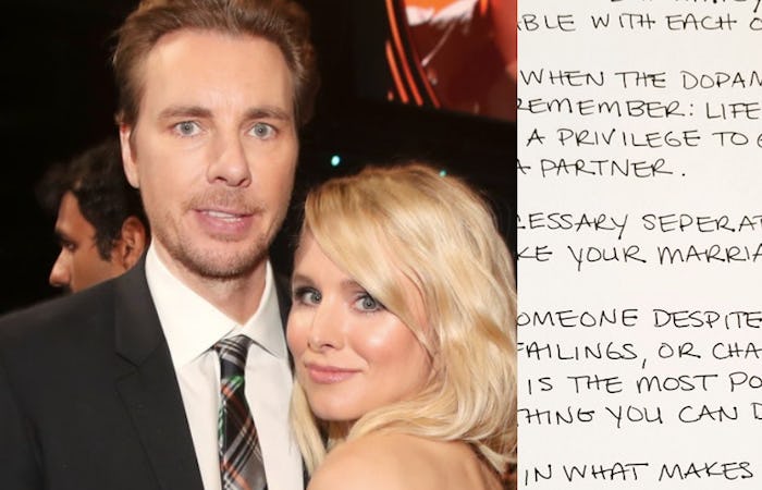 So when Bell was recently asked by a "nice man" to write a letter to his friends who were getting married, she decided to do something a little different. As she wrote on Instagram, "I wrote something congratulatory but then thought 'Kristen! Wait! You are an old married woman, shouldn't you have some wisdom to share?!' After I was finished I realized what I wrote is pretty much the A-Z of how @daxshepard and I keep our relationship healthy. Its worked for us so far, So here ya go. ♥️♥️♥️"